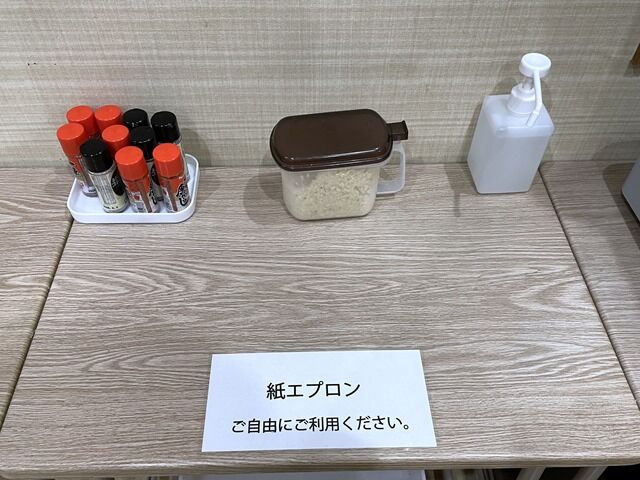 卓上調味料はありませんが、給水器の隣にニンニク、S&B あらびきコショー・一味唐辛子、紙エプロンを用意。