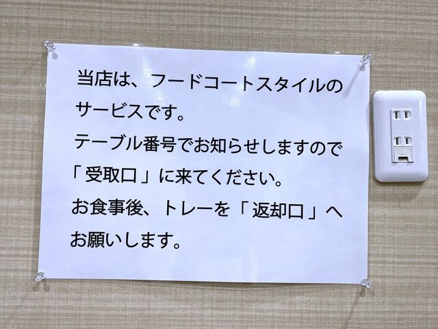 受付で食券渡して席番指定されて着席。席番で呼ばれて受取口に取りに行って、食べ終えたら返却口へというセルフと言うか学食スタイル。
