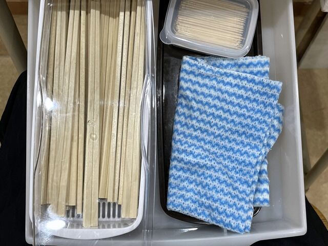 BGMは無しで東武鉄道の通過音かBGM代り。箸は机の引き出しに格納された割り箸。引き出しには箸の他にダスター、ティッシュが格納されています。