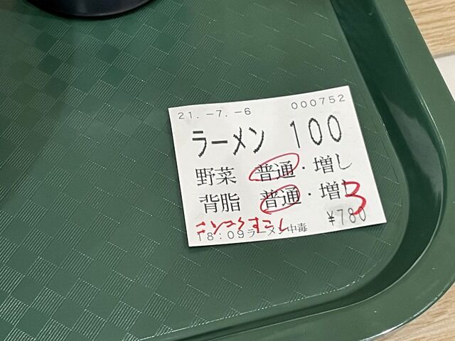 食券がオーダーシートになっていて、無料トッピングの野菜と背脂の量を丸で囲んで食券受取り口に提示します。