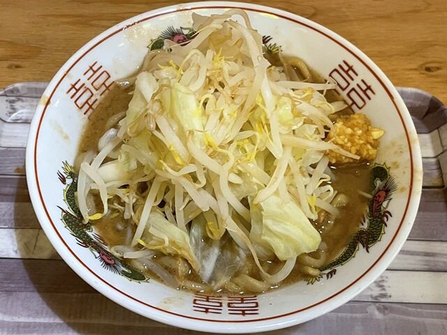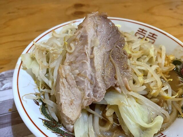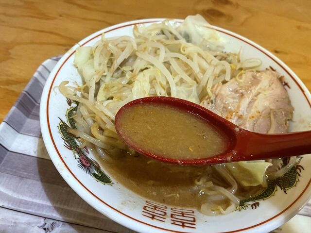 スープはドロッと濃厚なド乳化の豚骨醤油味。二郎系でここまで乳化が進んだのはそうは無く、濃厚つけ麺のつけ汁に麺をぶち込んだみたいな高ブリックス値。
