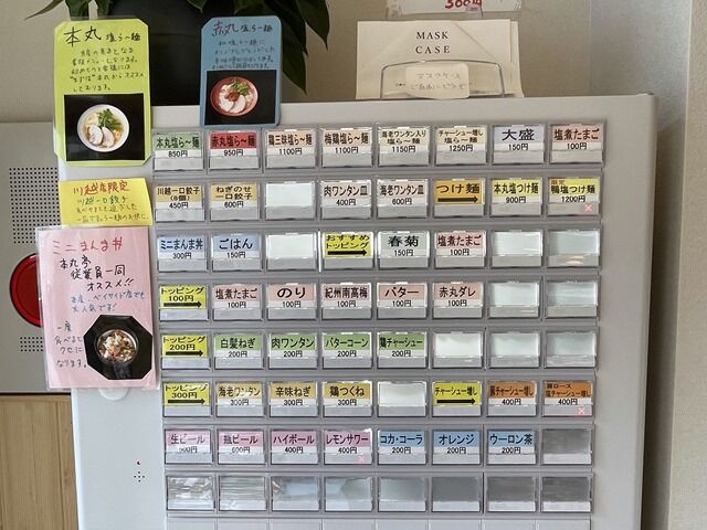 入店するとまず券売機で食券購入です。主なメニューは、本丸塩ら~麺850円、赤丸塩ら~麺950円、鶏三昧塩ら~麺1,100円、梅鶏塩ら~麺1,100円、本丸塩つけ麺900円、鴨塩つけ麺1,200円、他。ミニまんま丼300円はスタッフ一同推しのサイドメニュー。