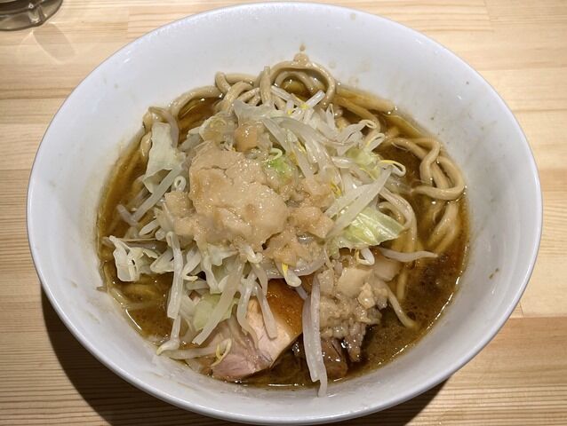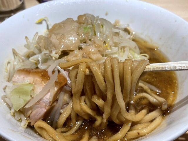 自家製の麺は平打ちのストレート太麺。トングでひらざるに取って。湯切りは重力任せでそのまま丼へという麺上げ。食べやすい適度なコシで、蓮爾的にはもう少しゴワついててもいいかも。となんだかんだ書きましたが、麺→スープヤサイ→時々ブタという一連のサイクルで完成する味。喰らう感覚の満足度高く充足感に満たされて美味しいしか勝たん!