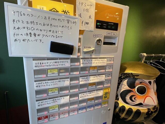 入店するとまず券売機で食券購入です。主なメニューはラーメン760円、たまラーメン860円、エピラーメン960円、つけ麺910円、たまつけ麺960円、エビつけ麺1060円、他。無料トッピングはやさい、にんにく、背あぶら。コールのタイミングは提供直前。