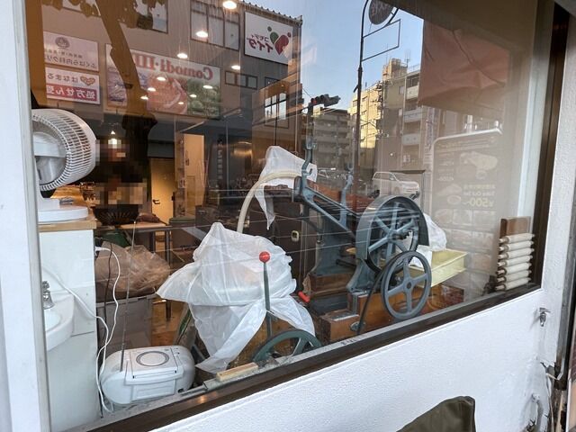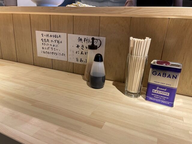 店内は中太を囲むL字型カウンター9席(8・1)。中待ち椅子2脚、外待ち椅子2脚。隔壁は特に無し。消毒液は券売機横に配置。入口入って右手、ガラス張りで外から見えるコーナーに製麺機が鎮座。給水器は店内最奥。れんげも給水器上。店内冷房が効いてなくてかなりの暑さ。