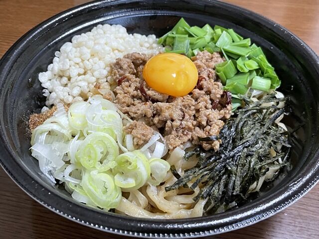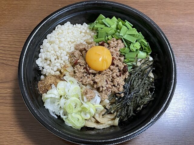 具は台湾ミンチ、卵黄、ねぎ、きざみ海苔、揚げ玉、ニラ、魚粉。