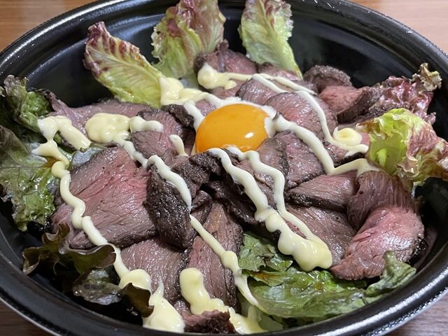 オンザライスのトッピングはローストビーフ、サニーレタス、卵黄。仕上げにマヨネーズ。