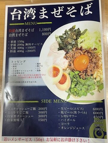 主なメニューは台湾まぜそば800円、特製台湾まぜそば1100円、ローストビーフ丼1300円、ステーキ丼1400円、他一品料理多数。イートインだと冷やしラーメンも出来るみたいです。