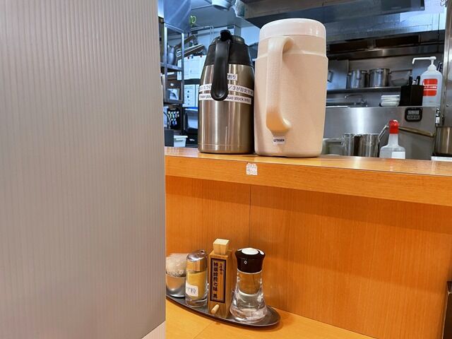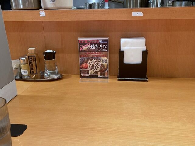 BGMは三味線の調べ。箸は割り箸。卓上調味料は個包装の胡椒、ゆず粉、六厘舎特選焙煎七味黒、酢。