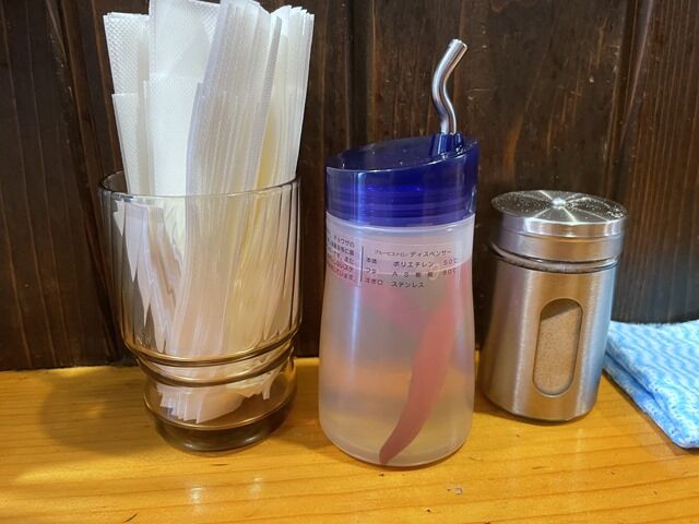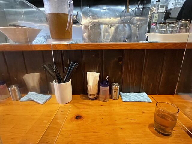 BGMはポップス。箸は洗い箸でエコ仕様。卓上調味料は唐辛子?の漬いた酢、胡椒。らーめん到着と前後して冷蔵庫から出したおろしにんにくの壺が提供されます。自分は辞退しましたが。ピッチャーの中身は冷たい麦茶。