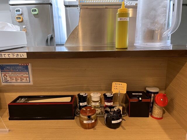 箸は割り箸。卓上調味料は醤油、酢、ラー油、豆板醤、ニンニク、すり胡麻。カウンター上に替玉ダレ。