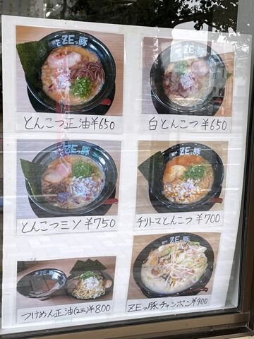 入店するとまず券売機で食券購入です。主なメニューは、白とんこつ650円、とんこつ正油650円、とんこつ味噌750円、チリトマとんこつ700円、つけめん正油(2玉)800円、チリトマつけめん(2玉)800円、ZEっ豚チャンポン900円、ZEっ豚味噌チャンポン900円、他。