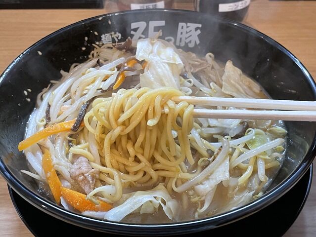 スープはとろっと濃厚な豚骨味噌味。もうもうと湯気が上がって撮影は難航。癖はありませんがドッ豚骨と呼びたい濃厚な豚骨スープに炒め野菜のエキスと旨味、海鮮の風味とコクが加わって、すごく美味しい!味噌は控えめであくまで豚骨を前面に感じる調味。それが野菜炒め目載せ味噌ラーメンではなくしっかりチャンポンを感じる仕立て。