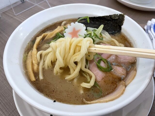 棣鄂製の麺はほぼストレート太麺。スープは「あっさり煮干し」ベースで、麺は「濃厚煮干し」用というハイブリッド型。ほぼうどんというもっちもち食感の麺。味噌が濃くなるに従い麺が活きてきて後半すごい美味しいってなります。