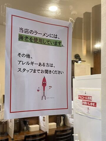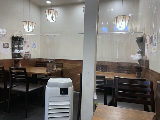 店内は厨房前に真っ直ぐなカウンター5席、2人卓x1、4人卓x2。カウンター1席毎に、4人卓は対面方向にアクリル板設置。4人卓と2人卓の間にビニールカーテン吊り下げ。消毒液は券売機横に配置。