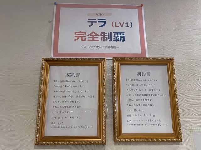 券売機上には、テラ(LV1)挑戦者の注文前に書いた契約書掲示。スープまで飲み干して掲示らしいのでハンパないって