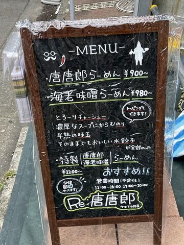 主なメニューは、唐唐郎らーめん900円、海老味噌らーめん980円、つけめん1000円、冷やし海老塩らーめん850円(限定10食)、他。麺類注文で「こだわりの土鍋ご飯」1杯サービス。