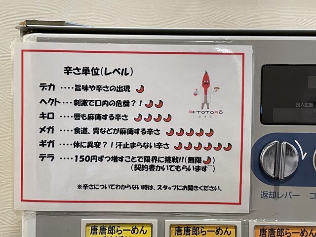 唐唐郎らーめんは辛さを下からデカ、ヘクト、キロ、メガ、ギガ(+150円)、テラ(+300円)の6段階で指定可能。