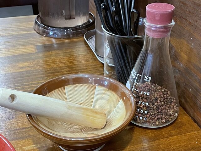 卓上調味料は三角フラスコに入ったホール(粒)の山椒。そのままでは使えませんが、「唐唐郎らーめん」提供時「ライスと山椒入りますか」と聞かれて、山椒をリクエストするとすり鉢とすりこ木が提供されます。