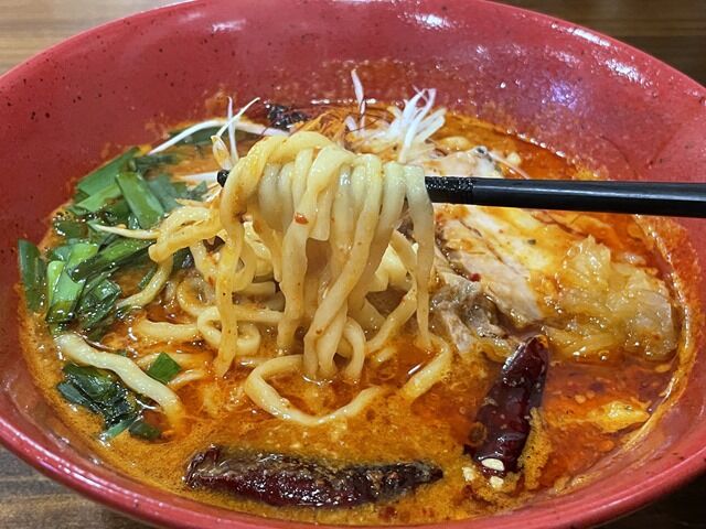 麺は中太縮れタイプ。移転前は三河屋製麺製でしたが同じでしょうか。個性的な海老辛スープを受け止めるコシとハリのある食感麺で、濃厚スープといいタッグを形成します。