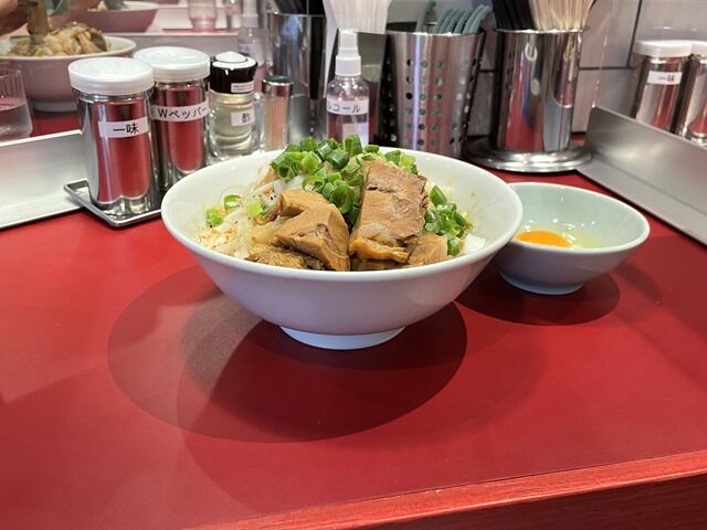 雷では汁あり注文が多かったので今回は汁なしにしてみました。汁なしにはデフォで生玉子が付きます。提供時「卵に浸けて食べて下さい」とアナウンスがあります。