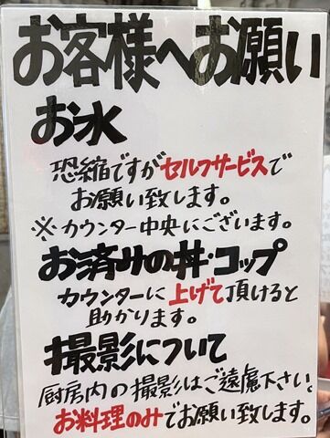 店内は厨房を囲むL字型カウンター11席(4・7)。店内待ちベンチ4席あり。カウンター1席毎にアクリル版の仕切り設置。消毒液は入口脇と各席に配置。店内厨房撮影禁止で、撮影は料理のみとのこと。なお券売機と卓上はセーフ。