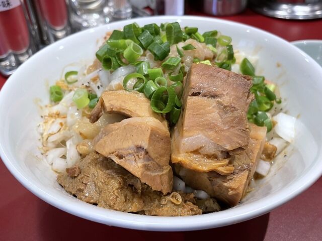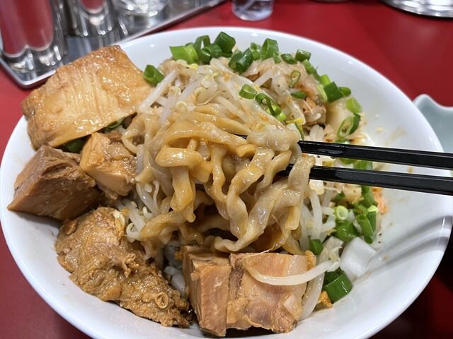 具はブタとヤサイ(もやし・キャベツ)、無料トッピングの青ねぎ(松戸産あじさいねぎ)。ブタは赤身のブロック肉がゴロゴロ。チャーシュー60g以上とのことですが、100g近くは優にありそう。