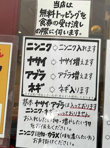 麺量はミニ150g、並盛250g+50円(汁無し+70円)、大盛350g+150円(汁無し+170円)。無料トッピングはニンニク(入れる)、ヤサイ(増し)、アブラ(増し)、ネギ(入れる)。コールのタイミングは食券回収時。