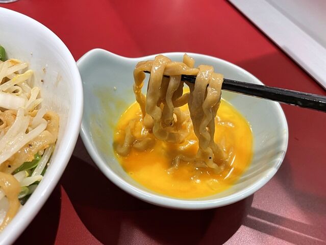 そして卵つけ麺、濃いタレが程よく中和されてこれまたウマい!ただ、途中からつけ麺にしてもしょっぱくなって卵かけ麺にスイッチ。だいぶしょっぱいって思ってたら、そういえば雷千葉駅前店で汁なし食べたときもかなりしょっぱかったのを思い出しました。