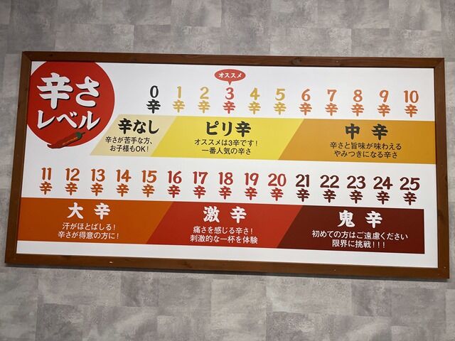 0辛は800円(-50円)、1辛~3辛は850円、4辛以降は1段階上がるごとに+20円(4辛870円、5辛890円…)。オススメは3辛。