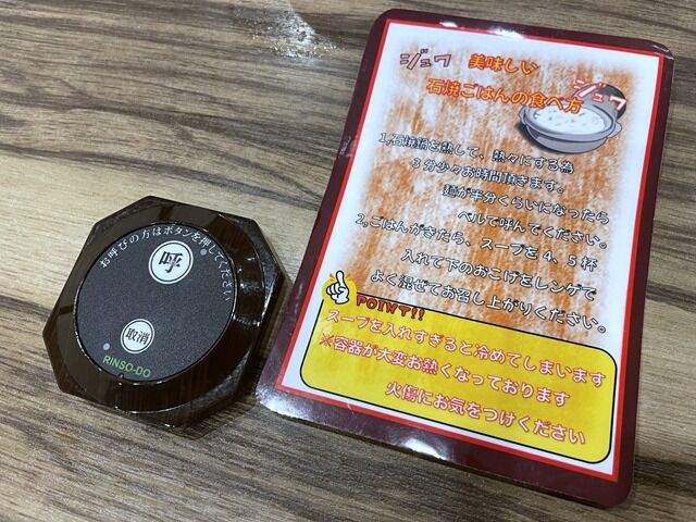 「石焼ご飯」注文時、食べ方の札を渡されます。石鍋を加熱するのに3分程かかるため、麺を半分くらい食べたらベルで呼んで石焼ご飯を注文。ご飯が来たら石鍋に4~5杯スープを入れておこげを混ぜて召し上がれ。