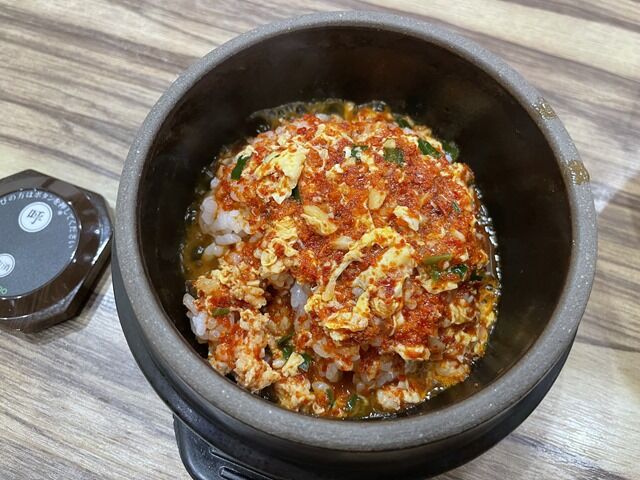 そこにスープを投入するとスープが一気に沸騰して石焼ウマ辛雑炊の出来上がり。ニンニクの効いたピリ辛の雑炊を、ハフハフしながらいただくのがたまらなく至福です。
