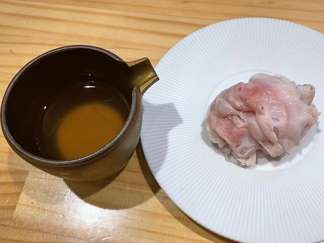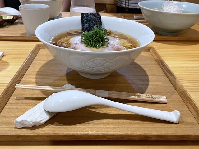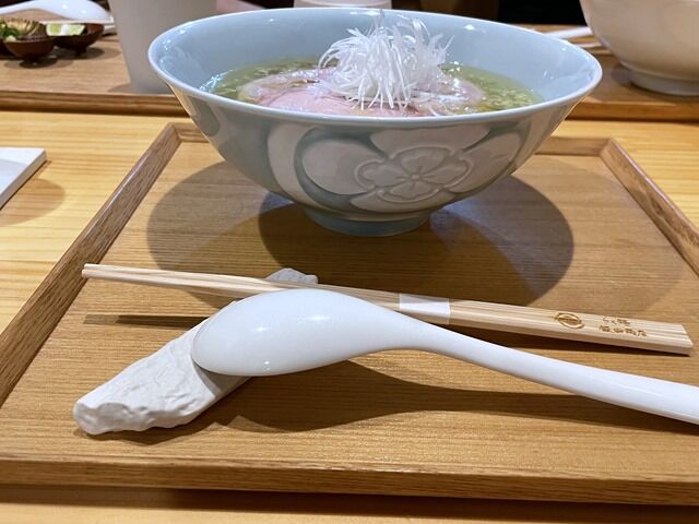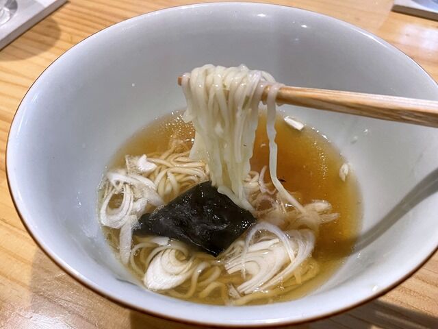 スープはそれまでの芸術作品、らーめん・つけ麺の最高峰といった神がかり的な逸品から一転、なんというか素の出汁が主役のシンプルで素朴で朴訥な味。ほっとする優しい味わいで〆に好適。麺はちゅるちゅると啜れる細縮れタイプ。肩肘張らずにリラックスしてほっこりとフィニッシュ出来ます。