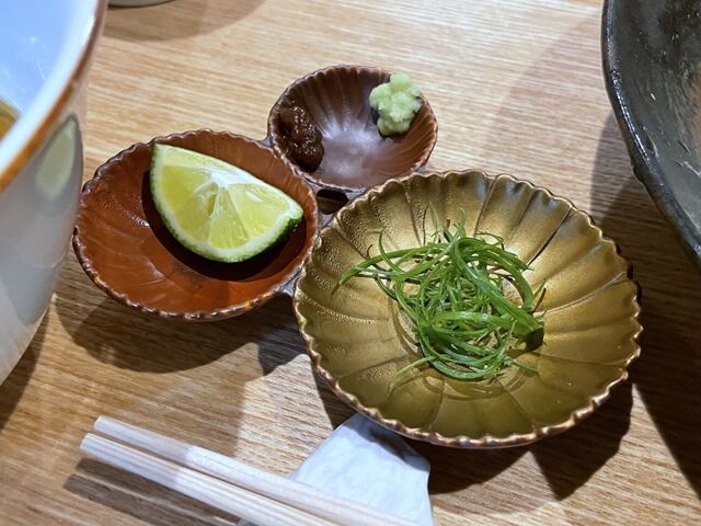 アイテム豊富で楽しみ方と食べ方無限大。この日の小皿は九条ねぎ、酢橘、わさび、ふき味噌。