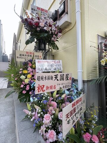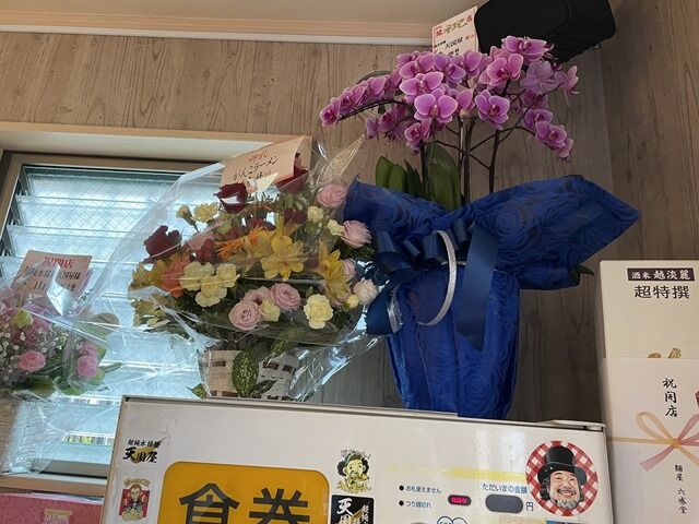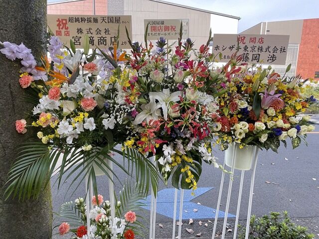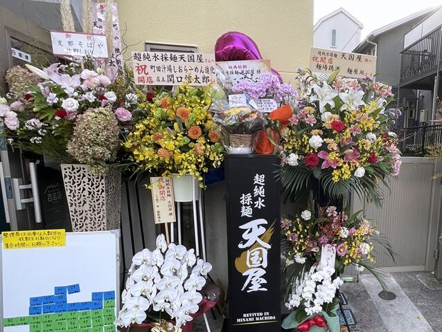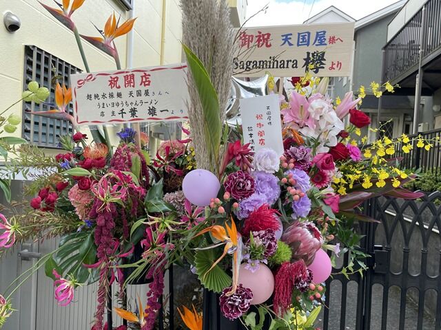 店頭には物凄い数の開店祝花・胡蝶蘭。気づいたところでは、支那そばや、進化、麺場鶏源・麺屋M、らぁ麺や嶋、麺屋はし本、うまいヨゆうちゃんラーメン、Sagamihara欅、なるめん・ひよこ、