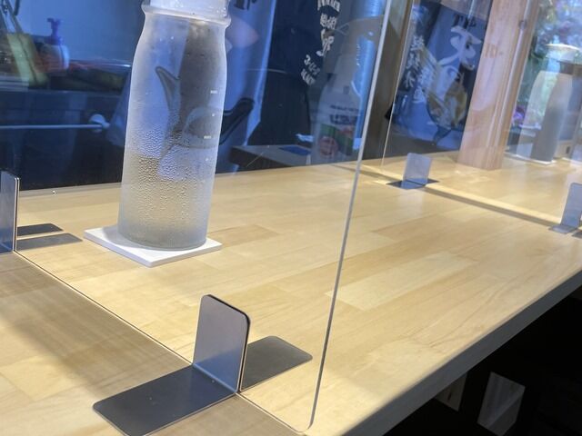 店内は窓のある壁の向こうが厨房で厨房の前に真っ直ぐなカウンター5席、4人卓x1、2人卓x2。カウンターは1席毎にアクリル板の仕切り設置。