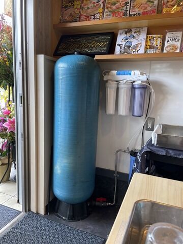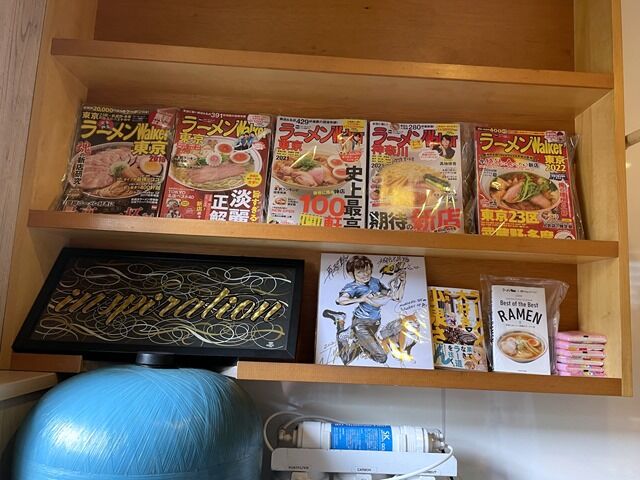 入口入ってすぐ左に逆浸透膜浄水器、その上にラーメンWalker等がディスプレイされた書棚。スタッフは佐々木店主さんとサポートの男女計5名。