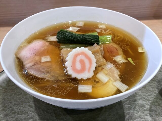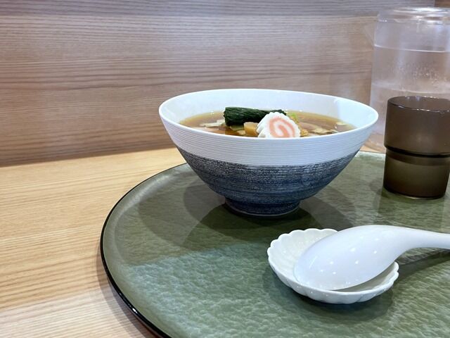 「羅臼昆布と鮭節の中華そば(肩ロース)」白と同じ下部が渋緑色の器で着丼。