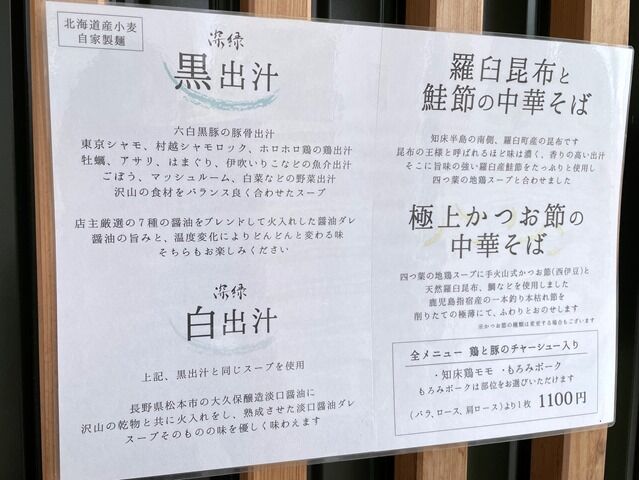 メニューは、深緑黒出汁、深緑白出汁、羅臼昆布と鮭節の中華そば、極上かつお節の中華そば 各1100円、他。オープン当初は黒出汁と白出汁のみでしたので、2品追加。