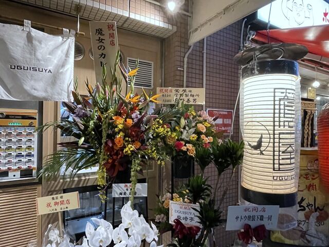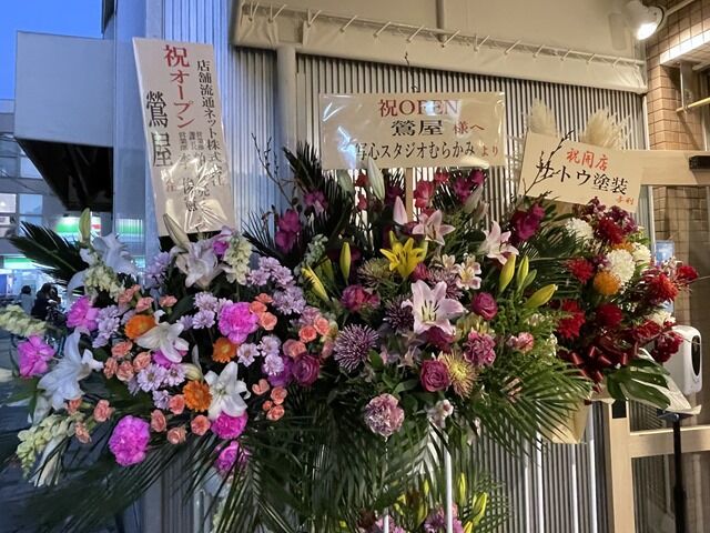 店頭にはたくさんの開店祝花と胡蝶蘭。気づいたところでは、八咫烏、魔女のカレー、彩音、柴崎亭、三河屋製麺から。