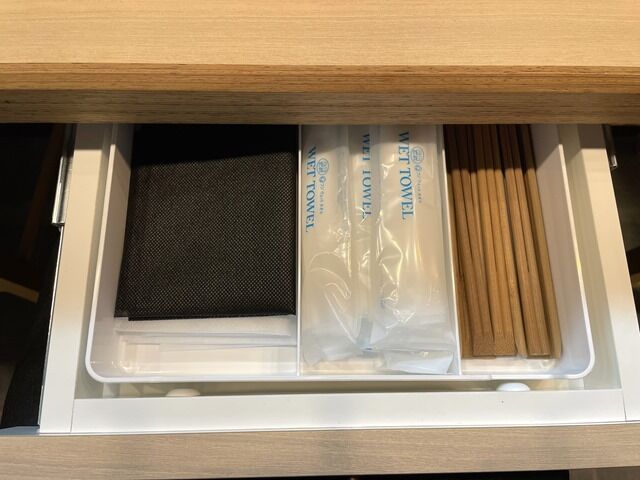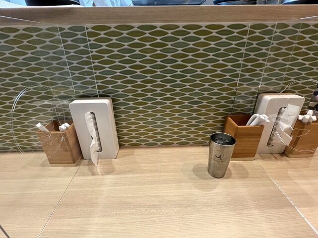 BGMはJ-POP。箸は割り箸。卓上調味料は無し。箸、ウェットティッシュ、紙エプロンはテーの引き出しに用意。