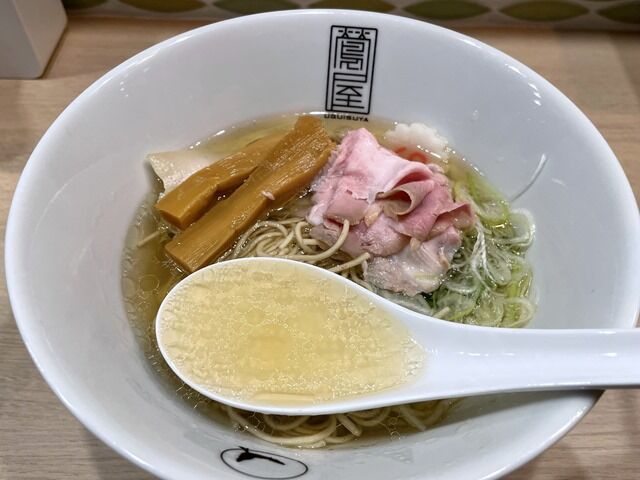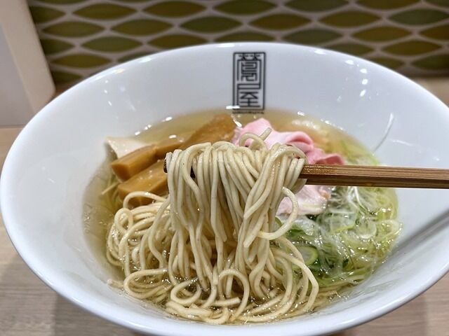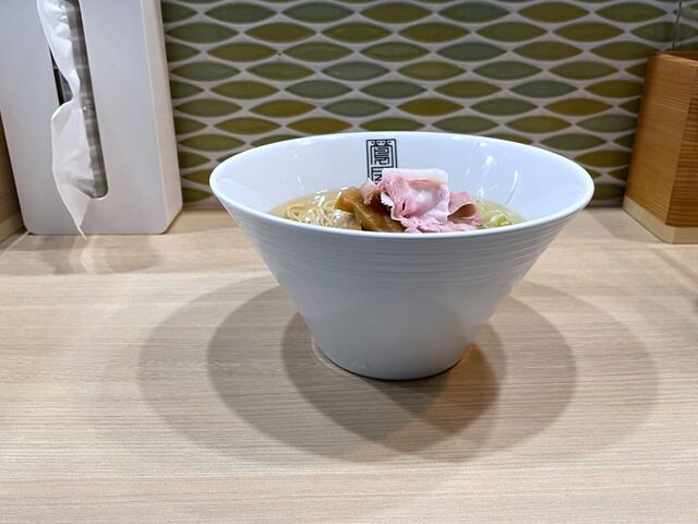 丼の底まで見通せそうな澄んだスープはさらさらの清湯塩味。動物性不使用の魚介出汁で、あっさりとして穏やか。優しくたおやかに旨みの詰まった味わい。清澄で静謐な中に深く濃密なうま味が溶出していてすごく美味しい!