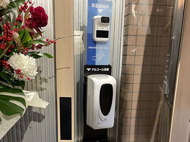 席間近く狭いですが、仕切りは大きめなので安心感があります。消毒液は入口前に検温器兼自動噴霧器配備。