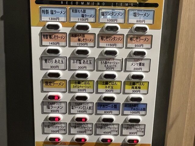 入店前にまず店頭券売機で食券購入です。主なメニューは、塩ラーメン800円、梅しそラーメン950円、青のりあえ玉300円、ネギ塩あえ玉300円、他。