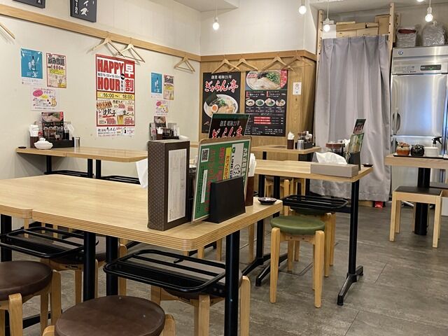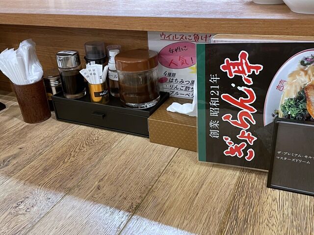 BGMはJ-POP、もう少しだけ、dynamite、焔とか。箸は割り箸。卓上調味料は胡椒、醤油、酢、ラー油、ソース。