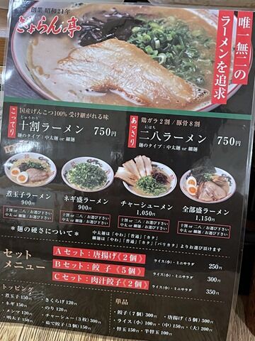 十割ラーメンは豚骨100%、二八ラーメンは鶏ガラ2・豚骨8。麺は中太or細麵から選択。麺の硬さを中太麵はやわ・普通・カタから、細麺はやわ・普通・カタ・バリカタから指定。最初は中太麺やわ、替玉を細麺カタなんて事が可能。