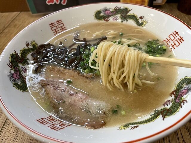 スープは軽く豚臭いとろっとした豚骨。通常の倍量の国産げんこつを長時間炊いたスープに、北九州ヤマニ醤油の吟醸薄口ベースのカエシを合わせたもの。現地そのままの味で何も変えていないとのことで、噂通りちょっとしょっぱ目。ですが個人的には十分許容範囲内。濃厚ながら重さ皆無。ざらつき感なく髄の旨みまでとことん溶け出した様な味わい。ショッパさが後引く癖になる感じですごく美味しい!