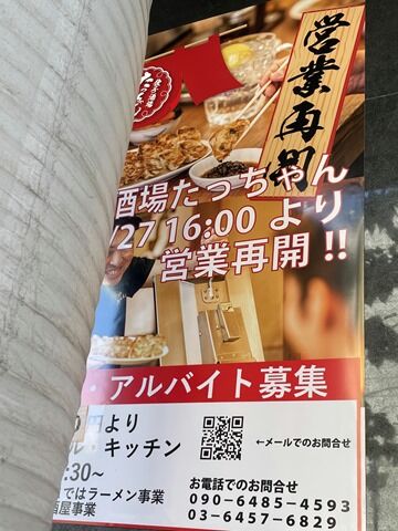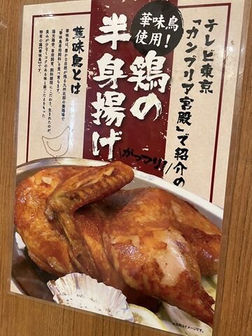 後客4。スタッフは厨房・ホールに男女合わせて5名。夜の「餃子酒場たっちゃん」の「鶏の半身揚げ」はテレ東「カンブリア宮殿」で紹介された名物メニュー。