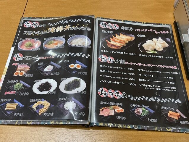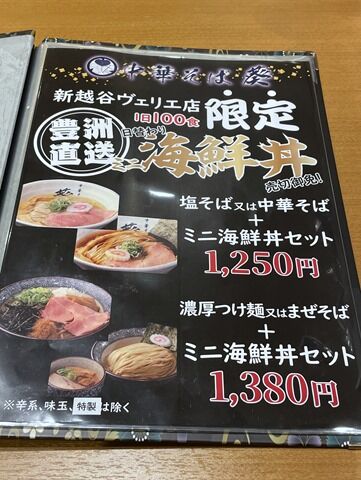 主なメニューは、新越谷ヴァリエ店限定ミニ海鮮丼セット(1日限定100食)塩そば・中華そば+ミニ海鮮丼1250円、濃厚つけ麺・まぜそば+ミニ海鮮丼1380円、