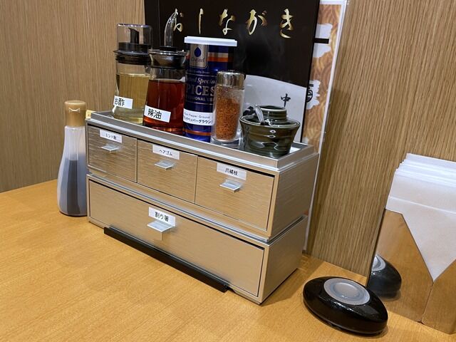 BGMはジャズ。箸は割り箸。卓上調味料は醤油、酢、辣油、Chefeel ブラックペッパー、一味唐辛子、柚子胡椒。カスターセットは本店と同じメタリックなボックス。